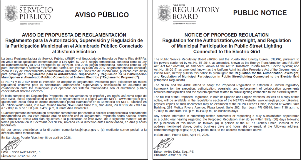 December 16, 2020El Negociado de Energía de la Junta Reglamentadora de Servicio Público de Puerto Rico (“Negociado de Energía”), al amparo de la Ley 57-2014, según enmendada, conocida como la Ley de Transformación y ALIVIO Energético de Puerto Rico, la Ley 147-2019, conocida como la Ley Especial de Procesos Administrativos Expeditos para Personas de la Tercera Edad, y de la Ley 38-2017, según enmendada, conocida como la Ley de Procedimiento Administrativo Uniforme del Gobierno de Puerto Rico, se propone enmendar el Reglamento Núm. 8543, Reglamento de Procedimientos Adjudicativos, Avisos de Incumplimiento, Revisión de Tarifas e Investigaciones.